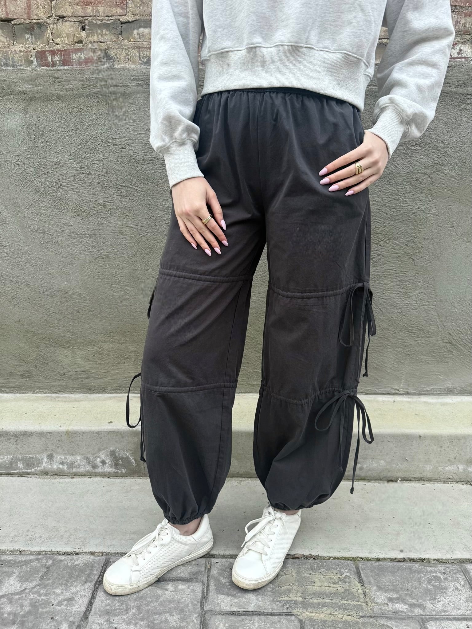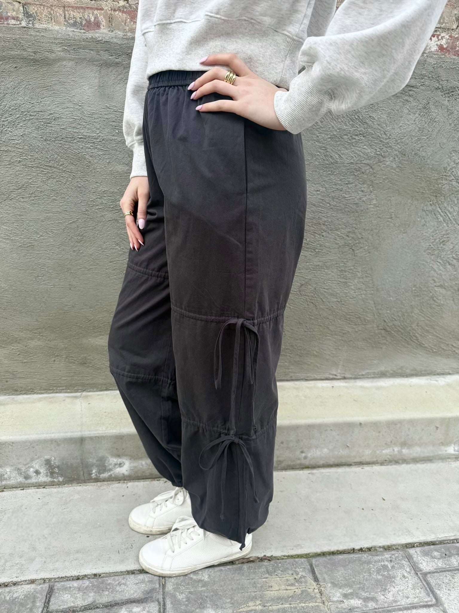 The Boston Bow Joggers feature a stretchy waistband and decorative side bows that can be untied for styling flexibility. With a subtle balloon flare that cinches at the ankles, these joggers are the perfect balance between a relaxed yet stylish look. Made from lightweight, dark charcoal fabric, these joggers are ideal for lounging, running errands, or casual outings. They are a simple, everyday piece that will instantly add a feminine touch to any look.