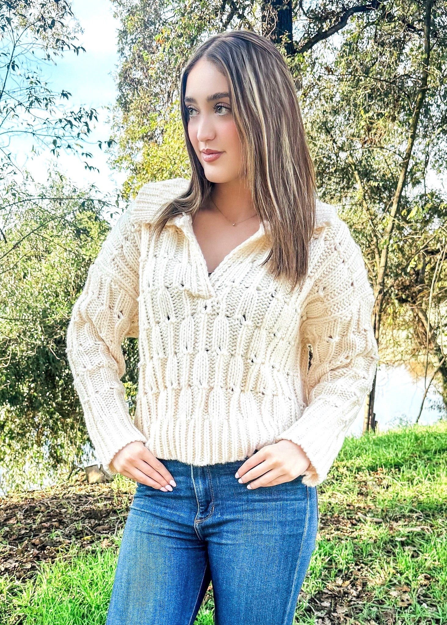 The Buttercream Bliss Knitted Sweater features a subtle collar and a clean V-neckline for a modern, simple look. With its textured feel and rich, intricate knit pattern, this versatile sweater is one you’ll reach for time and time again.